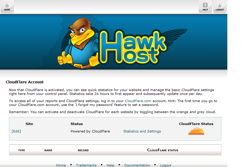 Simple! Login to your web hosting account and select the “CloudFlare” option (picture). From there select the “Statistics and settings” link (picture).