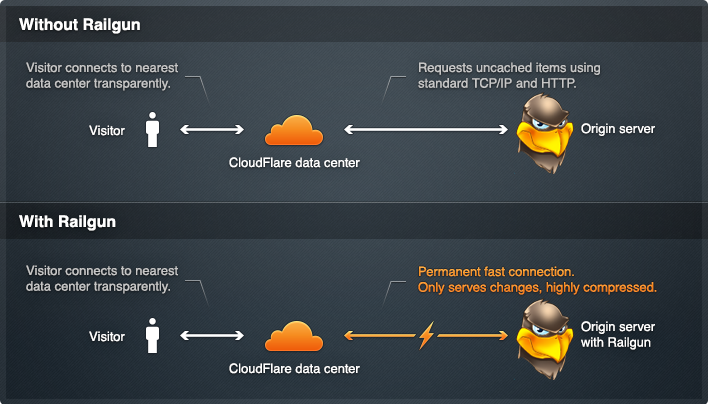 If a website has Railgun™ enabled on their website CloudFlare will see if it has the cached content in their data centers. If found it’ll serve the compressed / cached content to the user directly from one of their data centers closest to the person making the request.