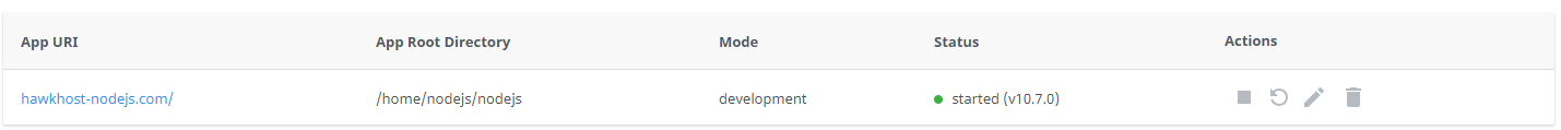 If you move back to the web applications page on the Node.js App page you’ll now also note you have a list of all your Node.js applications with all their relevent information as well as ability to quick stop/restart, edit and remove the application.