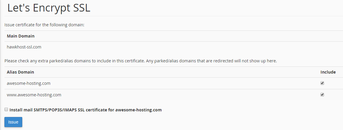 From there you’ll get a list of your domains. Simple select the domain you want to issue the SSL certificate for and select “Issue”: