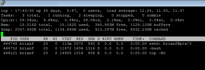 As you can clearly see the user running ’top’ with CageFS can only see their running processes and nothing else (other users, system processes, etc).