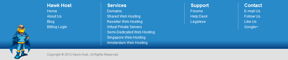 We added our semi-dedicated services to the navigation, made a more pronounced ‘Contact Support’ option, and added links to like us / follow us on Facebook, Twitter, and Google+. In addition to the header changes, we also made wholesale changes to our footer: