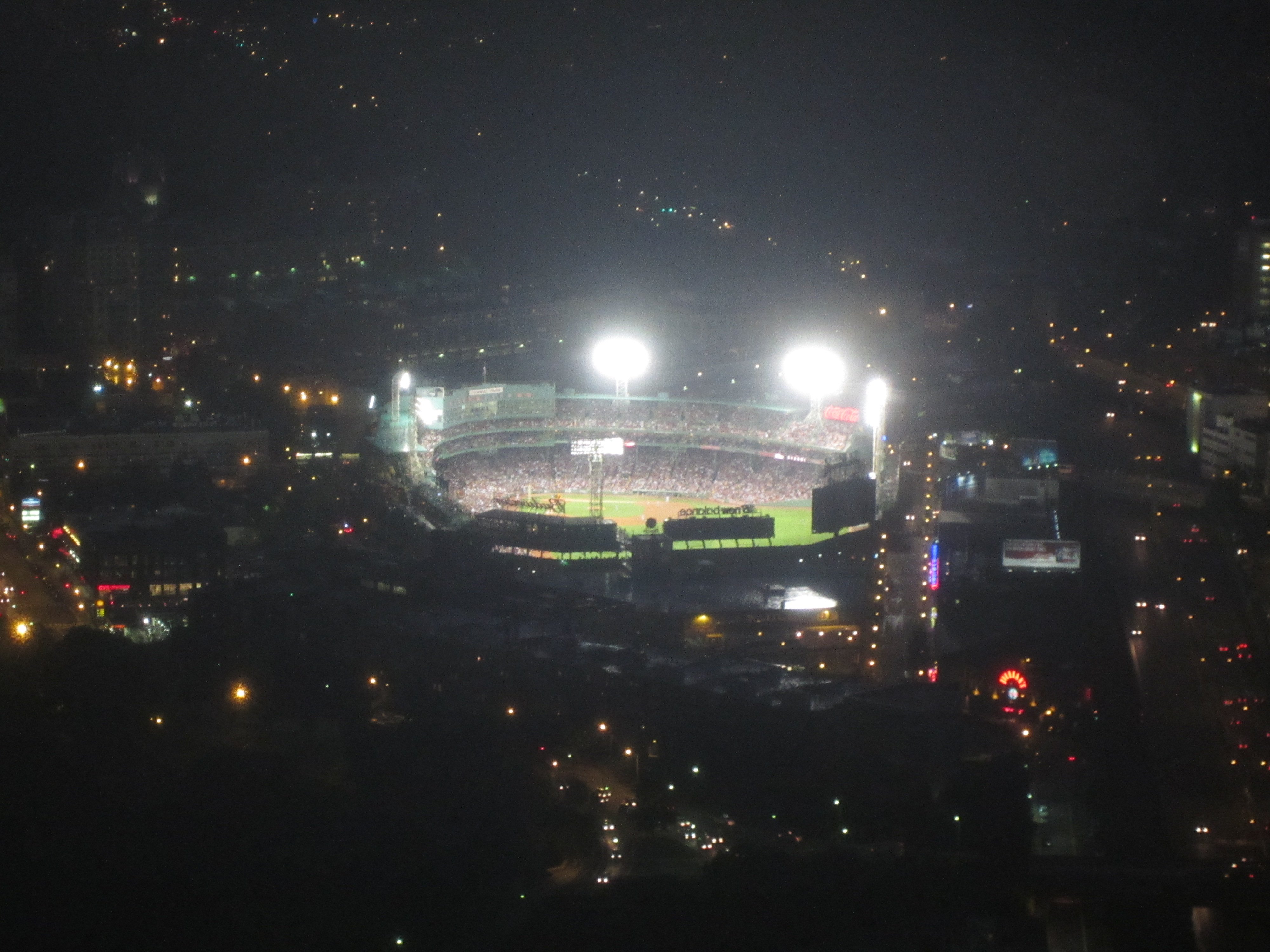 Originally, or at least we’re told, the party was supposed to be held on the roof and we’d be outside overlooking the gorgeous Boston skyline. As a photography nerd, this made me really excited at the prospect of getting some shots of the entire city and generally enjoying the scenery. Unfortunately lady luck was not on our side, and mother nature decided to bring in quite the storm a few hours before the party started. In fact, there were even flash flood warnings for the Boston area, and rumor has it some floors of the tower even took on water. As it were we had to “settle” for the 50th floor, which still provided an unprecedented view of the city, or at least when you could see through the clouds. In addition to being a photography nerd, I’m also a diehard baseball fan. Right in our line of site was the home of the Red Sox, Fenway Park. Fenway is one of the most historic parks in all of baseball, home of legends like the Green Monster, Ted Williams, and (while Boston fans won’t like this), the Curse of the Bambino.