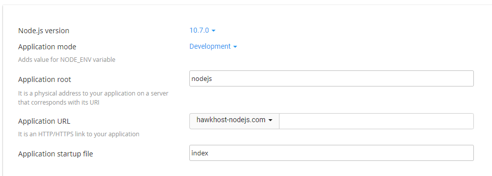 On this page you’re going to then create an application and you’ll see options to specify the version, application mode, application root, application URL and your applications startup file.